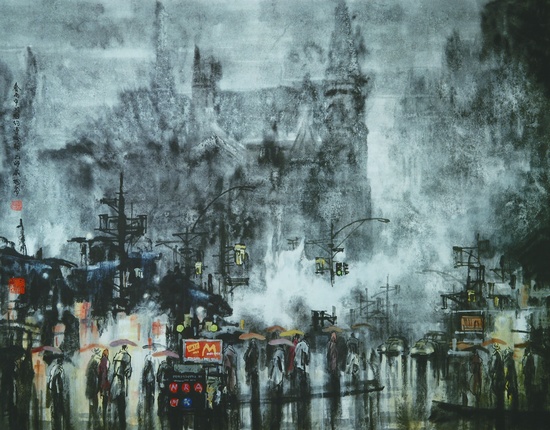 “過去朋友跟我開玩笑,說我的老三篇就是雨、雪、夜;實際上除了雨、雪、夜之外,還有一個很重要的系列,就是都市山水。”徐希說。移居美國后,他的創作題材更擴展至描繪世界各地風光,使他不再拘泥于江南的雨、夜,都市山水亦成為他的重要創作對象。“城市山水這幾年一直在發展,但大家也有點尷尬:中國水墨的這種柔軟、散發性的東西,與今天城市的邏輯關系,是很矛盾的狀態——今天城市是直線條的,而用毛筆怎么也畫不成一根非常直的線條,這是一種現實。”北京畫院美術館館長吳洪亮表示。徐希的“解決之道”,是關注“黑白”。“上大學時,我學的是版畫,所以我在畫中糅入了大量黑白的概念,我自己在畫中國畫的時候,腦子還是很清楚的:用版畫的底子直接在宣紙上作畫,但是版畫的痕跡很重;我到美國之后,我的畫更含蓄了,這對于我來說是個很大的飛躍,我把西方許多色調融入到水墨當中。”