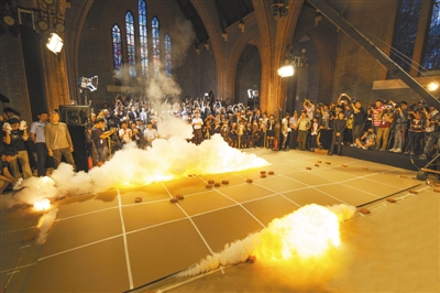 昨日記者現場看到,蔡國強先開始作畫,并鋪好火藥。下午5點半,在一切準備就緒后,蔡國強開始點火。在短短的7秒左右,巨大的爆破聲中濃煙彌漫新天安堂,7.44米×2.42米的火藥畫《故鄉(xiāng)》也隨之完成。