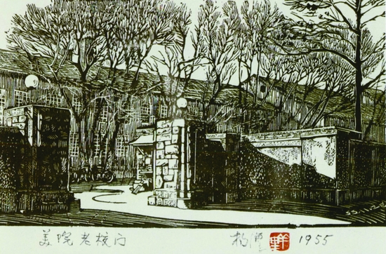 60年過去了,學校早已遷到城外寬敞的新校區,老校址拆遷,變成協和醫院的新病房樓。我刻的《美院老校門》變成校友回憶母校的紀念品,上世紀80年代中央美術學院美術館收藏了一幅并幾次展出。李樹聲先生收到一幅復制品(木板有損)后感慨地說:“在里邊住了46年!太有感情了。 ”李可染先生、師母鄒佩珠先生見到后也說:“老美院,太熟悉,感情很深啊! ”老校園里有徐悲鴻、吳作人老院長的身影,有齊白石老人上課的痕跡,有李可染、李苦禪、李樺、古元等老一代宗師授課的回音。