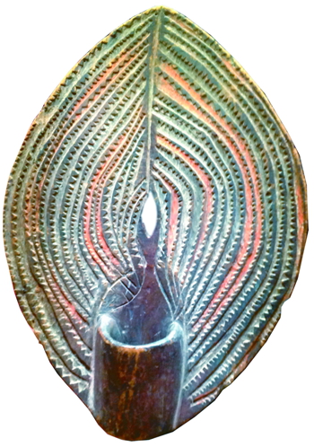 仔細(xì)觀察非洲最引人注目和具有代表性的傳統(tǒng)兵器展品——“飛刀”,你會(huì)發(fā)現(xiàn)它和一般的刀不一樣,它更為強(qiáng)調(diào)刀的刃部,使那部分比一般的刀更為薄而有力,而在飛刀刃部的地方都會(huì)有一些非常細(xì)膩的裝飾,有的還會(huì)在手柄部分加入裝飾性的保護(hù)物,這是冶鐵的鐵匠或藝術(shù)家們?cè)谧詈蟠蛟煳淦鲿r(shí)添加上去的細(xì)小裝飾。所以,一件在戰(zhàn)爭(zhēng)中具有很強(qiáng)殺傷力的兵器,當(dāng)被作為藝術(shù)品欣賞的時(shí)候也可以很美。