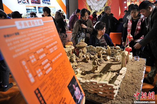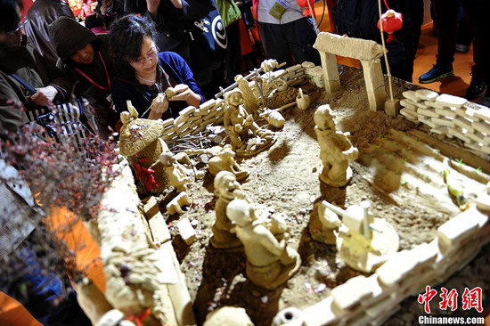 當日,在1號館內,來自黑龍江省的泥塑藝人郝鳳玲在一個泥塑農家院旁,現場演示制作一個泥塑農家漢子。 這個祖孫三代居住的泥塑農家院有住房、糧倉、石磨、板凳等,院落內還有一小片自留地,上面還有綠油油的菜苗等。泥塑生動的再現了農家小院的微縮全貌,吸引了不少觀眾駐足觀賞。中新網記者 金碩 攝