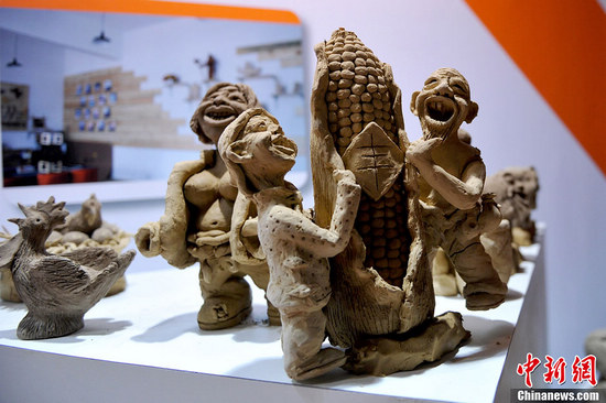 11月7日,第八屆北京文博會在北京國際展覽中心正式開幕。本屆文博會以“促進文化貿易 加快經濟升級”為主題,安排了六大系列100余場活動,設置16個主題展區,1800多家來自國內外的文化創意企業參展。圖為泥塑人物。中新網記者 金碩 攝