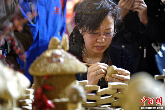 11月7日,第八屆北京文博會在北京國際展覽中心正式開幕。本屆文博會以“促進文化貿易 加快經濟升級”為主題,安排了六大系列100余場活動,設置16個主題展區,1800多家來自國內外的文化創意企業參展。圖為觀眾體驗傳統手工藝作品。中新網記者 金碩 攝
