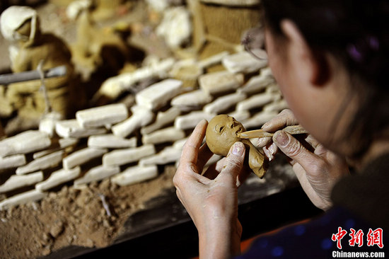 11月7日,第八屆北京文博會在北京國際展覽中心正式開幕。本屆文博會以“促進文化貿易 加快經濟升級”為主題,安排了六大系列100余場活動,設置16個主題展區,1800多家來自國內外的文化創意企業參展。圖為泥塑藝人正在趕制摔壞的人物。中新網記者 金碩 攝
