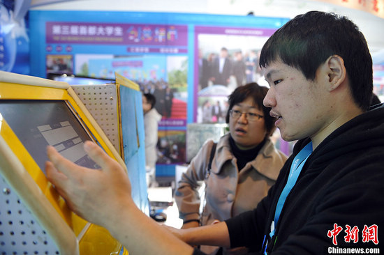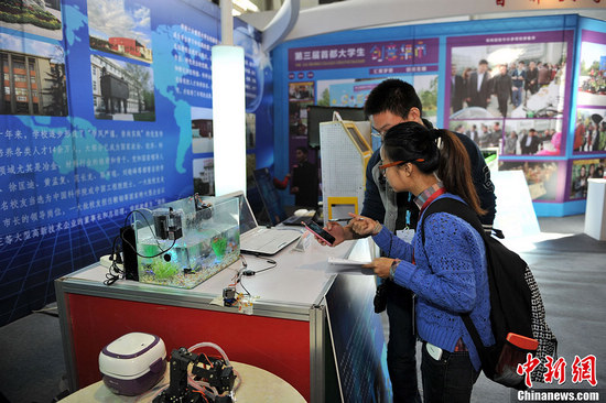 11月7日,第八屆北京文博會在北京國際展覽中心正式開幕。本屆文博會以“促進文化貿易 加快經濟升級”為主題,安排了六大系列100余場活動,設置16個主題展區,1800多家來自國內外的文化創意企業參展。圖為首都大學生創意集市上學生為觀眾講解。中新網記者 金碩 攝