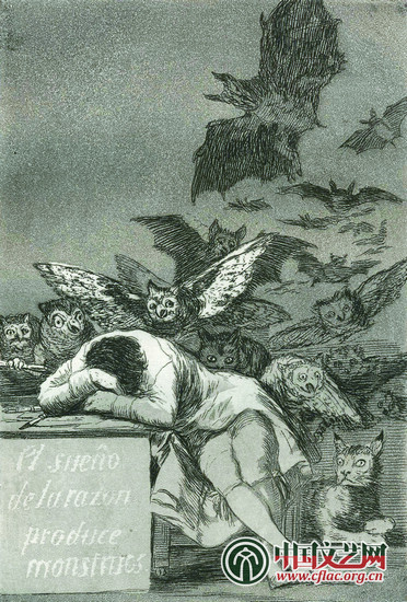 在西班牙黃金時代行將結束的18世紀、19世紀,戈雅重新建立起模擬自然與展現繪畫現實兩個看似對立的真實,并到達了藝術的頂峰。繪畫的真相超越敘事再現之后是否已經完全走向內在的自省?戈雅的作品帶給我們簡單而復雜的回應。他以多方面的才華,將復雜的形式與主題展現于世人面前。他對視覺形象表達的直接與尖銳,以及對傳統歷史畫技巧的顛覆,都具有巨大的啟示意義。而其作品中的道德性、美學性和主題把握的敏銳性,都是非常超前的,即便在今天也不失其現實意義。正像戈雅所呈現的版畫世界一樣,西班牙藝術始終處于一系列現實與幻想相互制約的平衡之下,并以歷史的方式帶給人們新的視覺真理。戰爭與幻想,奇情與冷靜,是戈雅留給世人的另一個超越現實的藝術世界。
