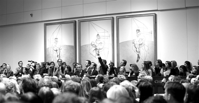 前晚的紐約一夜足以證明西方藝術(shù)品市場(chǎng)的火爆。當(dāng)晚紐約佳士得舉行戰(zhàn)后當(dāng)代夜場(chǎng)拍賣,其中培根創(chuàng)作于1969年的《弗洛伊德肖像畫習(xí)作》(三聯(lián)畫)成為全場(chǎng)焦點(diǎn)。此畫是培根為他的朋友兼對(duì)手——畫家盧西安·弗洛伊德所繪,被認(rèn)為是培根最偉大的作品之一。該作品估價(jià)能拍出8500萬(wàn)美元。