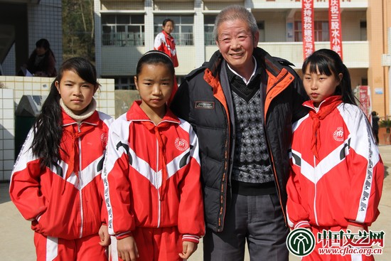 原敦煌文聯主席朱鋌以60歲的高齡主動請纓參加中國文聯文藝支教活動,成為走進三股水小學的第一位書法老師,在離別之時,他與學生們合影留念,希望還有再見之時。 中國文藝網 丁薇 攝