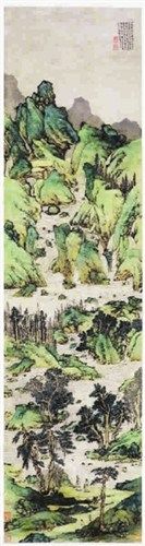 圖繪崇山疊壑,有涓涓細流從山頭巖隙泄下,合成溪流、水塘,曲曲折折,又從山巖間分流而下,聚成池塘,繼續從巖崖間爭流而下,至山腳匯合成河,奔流而去。河對面坡岸,高樹成林,有士人游蕩其間。全圖氣勢宏偉,曲折奔放,無論山石、樹木、水流,勾線沉著凝練,皴筆不多,只在山石的折轉處及石根部保留短筆的披麻皴。而滿圖的青綠設色,優雅古穆,卻也給后人留下頗具文徵明特色的畫風。