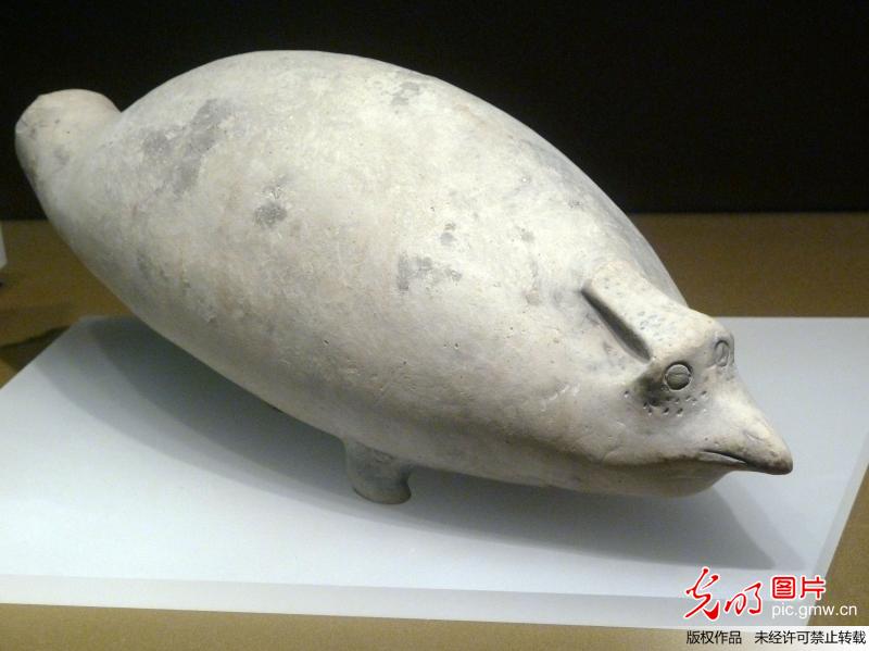 2014年1月5日,南京博物院歷史館,長著一副怪鳥嘴臉的江豚形陶水壺 王路憲攝