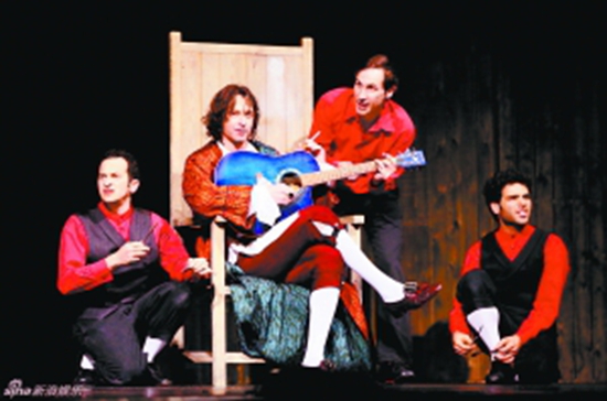 蓋謝爾劇院的這版《唐璜》,由以色列最當(dāng)紅的偶像級演員薩沙·杰米多夫扮演,這位除了戲劇之外同時也是眾多電視電影作品主角的“男神”,無可匹敵的個人風(fēng)采和揮灑自如的表演,令舞臺上下都為之一振。當(dāng)他領(lǐng)著仆人斯卡那爾跑下舞臺,在首都劇場的觀眾席里穿梭來往,尋找美女時,大概不少女觀眾都在心里期待著他笑著點頭,用剛學(xué)的中文說道:“漂亮,漂亮!”