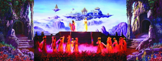 新版《牛郎織女》的舞美是本劇的最大創新,大量3D技術的運用讓舞臺變成了以假亂真的“實景”演出,這對于習慣于視頻圖像和3D技術的年輕觀眾無疑極富吸引力——毋庸置疑,傳統戲曲舞臺呈現的抽象性、虛擬性有其獨特的審美特質,但當下年輕受眾的娛樂欣賞習慣使他們一般不會靜坐“聽戲”,在沒有一定欣賞基礎的前提下,更不會在欣賞戲曲唱腔的同時來發揮想象,進行再創造。而通過炫酷的技術呈現方式,吸引更多人走入劇場“看戲”,在感受新技術帶來的視覺、心理沖擊的同時,去了解戲曲,從而培養可能的新觀眾群,無疑是一種值得肯定的嘗試。