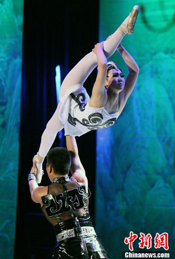4月14日晚,臺北“國父紀念館”大劇場,來自大陸的孟宛青、袁飛表演雜技《邀月弄影——芭蕾對手頂》,贏得陣陣喝彩聲。中新社發 董會峰 攝