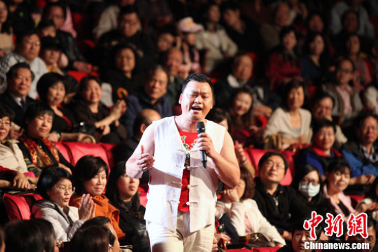4月14日晚,臺北“國父紀念館”大劇場,被譽為“西部歌王”的大陸著名男高音歌唱家、原生態歌手高寶利,從觀眾中間唱到臺上,贏得陣陣掌聲。中新社發 董會峰 攝