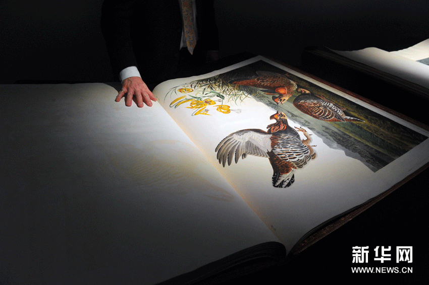 當天,紐約市佳士得拍賣行展出《美國鳥類》一書珍藏本。該珍藏本將于4月20日在紐約進行拍賣?!睹绹B類》由美國鳥類學家、畫家和博物學家詹姆斯·奧杜邦在1827年創作,真實描繪了400多種生活在美國的鳥類,其畫作大小與實物完全一樣。該書曾被譽為19世紀最偉大和最具影響力的著作,目前世界上僅存119本。其中由私人收藏的一本在2010年英國倫敦拍賣會上拍出了將近732.13萬英鎊(約合人民幣7657.79萬元)的高價,成為“世界上最昂貴的圖書”。新華網圖片 王雷 攝