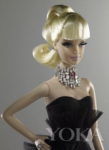 藝術家斯特法諾-坎杜里設計制造的這件孤品芭比娃娃身著黑色露背晚裝,身材與其他的芭比一樣令人窒息,所不同的是,她的脖子上帶了一串裝飾著一顆重達1克拉的方形粉鉆項鏈。