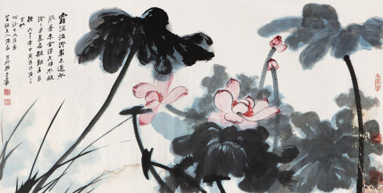 自古以來,荷花以其“出淤泥而不染、濯清漣而不妖”,“可遠觀而不可褻玩焉”的高雅氣質備受到文人墨客的喜愛,成為他們經常描繪的對象,畫荷高手層出不窮,張大千亦是此中翹楚。荷花的形象或逸筆寫意,氣韻十足,或工筆描繪,纖毫畢現,或復筆重彩,豐厚濃重,晚年更創潑墨、潑彩新貌,令人嘆服。本幅《水殿荷香》即是其工意相兼的精彩佳作。