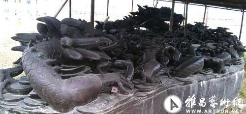 石匠石保國告訴東方網(wǎng)記者,洮硯的觀賞性已經(jīng)遠(yuǎn)遠(yuǎn)大于實用性,“人們一般把它擺放在客廳、書房甚至是院子里,以凸顯文化韻味,甚至還有招財進(jìn)寶的意思”。東方網(wǎng)記者在制作車間看到,大部分洮硯上雕刻的圖案均與錢幣有關(guān),且體積不小。在甘肅岷縣洮硯開發(fā)公司對面的學(xué)校廣場上,一座長約15.8米、寬3.28米、高1.68米、重約99噸的中華龍硯靜靜地躺著,“龍身”雖已有些損壞,估價近10億元人民幣。