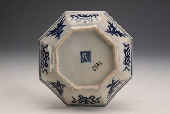 隆慶一朝時間較短,景德鎮(zhèn)窯瓷器遺留傳世的器物并不多,以小件器為主,少見大器,胎、釉較細膩。青料用回青,呈色穩(wěn)定、純正,藍中泛紫,但不像嘉靖器般紫得厲害。紋飾與嘉靖朝相近,佛道內(nèi)容較多。多六角、八角等造型。帶年款的器物甚少,官窯器的款識有“大明隆慶年造”和“隆慶年造”兩種,不見“制”字款;民窯器款有“隆慶年造”或“制”四字款;吉語和贊頌語款有“萬福攸同”、“福壽康寧”、“富貴佳器”等。因此,這件帶年款的八角盤雖為民窯器,但也彌足珍貴。