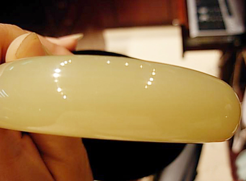 俄羅斯料特別得白,像白紙一樣的僵白,游刃性比較差,顆粒相對粗一些。用手電看的時候,有顆粒感,我們叫它鹽粒性,就像鹽巴堆起來的感覺。而且它的糖色比較重。像市場上賣的手鐲,糖色很重的,是俄羅斯料的可能性大一些。