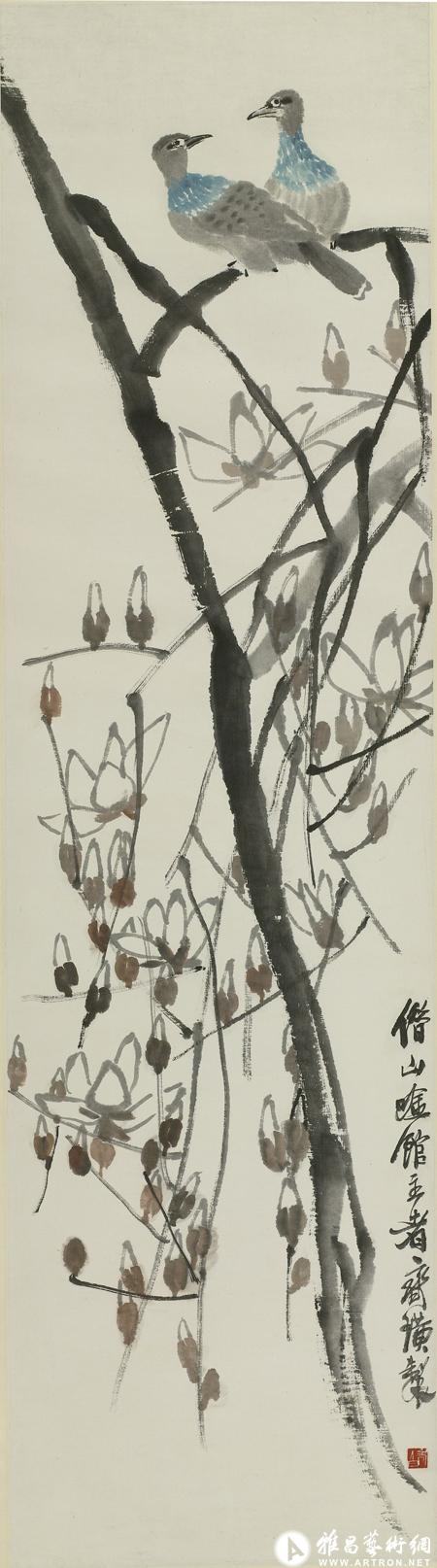 齊白石的《玉蘭斑鳩》更是件不可多得的佳品。該作是白石老人中期繪制的玉蘭斑鳩圖軸,筆墨老到,精致素雅,傳承有序,是當(dāng)下市場(chǎng)難得一見(jiàn)的齊白石中期佳作。該作品最早在1957年“齊白石遺作展”上出現(xiàn)過(guò),隨后于1958年1月在“齊白石遺作展覽會(huì)”上展出,這一展覽是由中華人民共和國(guó)文化部、中國(guó)美術(shù)家協(xié)會(huì)和北京蘇聯(lián)展覽館文化館共同主辦的,頗具權(quán)威性。該作自1957年開(kāi)始,先后出版數(shù)十次,流傳有序。畫(huà)中所繪整株玉蘭,只放著寥寥數(shù)朵花瓣,其余均含苞待放,恰似初春乍暖還寒。玉蘭花萼上細(xì)小的茸毛,特征細(xì)節(jié)繁多。除了主要的樹(shù)干外,樹(shù)枝和花朵均以淡墨和淺色處理,更突出了枝頭上兩只顧盼生姿的小斑鳩,在乍暖還寒之際,報(bào)告了春天的來(lái)臨。齊白石筆下玉蘭花,總是給人以春風(fēng)送暖的感覺(jué)。眾所周知,玉蘭花是知春報(bào)恩之花,齊白石曾在一幅玉蘭圖軸上題“草木逢春君先知”。白玉蘭,潔白芳香,清香遠(yuǎn)溢,猶如雪濤云海,蔚為壯觀,是中國(guó)著名的早春花木,有“應(yīng)春花”、“望春花”之別號(hào)。