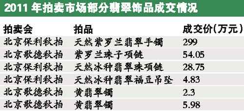 紫羅蘭翡翠則更是異軍突起,據(jù)藍(lán)麗君介紹,一般來(lái)說(shuō)紫色濃的紫羅蘭翡翠的種就不好,種好的色彩又不濃,如果是色彩濃、種又好的紫羅蘭翡翠,其價(jià)格甚至超過(guò)綠色翡翠。在北京保利2011年秋季拍賣(mài)會(huì)上,兩件紫羅蘭翡翠飾品都以高價(jià)成交,其中一只天然紫羅蘭翡翠手鐲評(píng)估價(jià)為260~380萬(wàn)元,最終成交價(jià)格高達(dá)299萬(wàn)元。北京歌德2011秋季拍賣(mài)會(huì)上一串紫羅蘭珠子項(xiàng)鏈以54.05萬(wàn)元的價(jià)格成交,高出之前的評(píng)估價(jià)格。