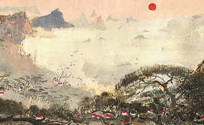 《毛主席詩意冊》(局部)是傅抱石的代表作之一,作于1964—1965年間。作品有大膽而富于變化的構圖、瑰麗而沉毅的色彩,充滿浪漫主義的詩情畫意。