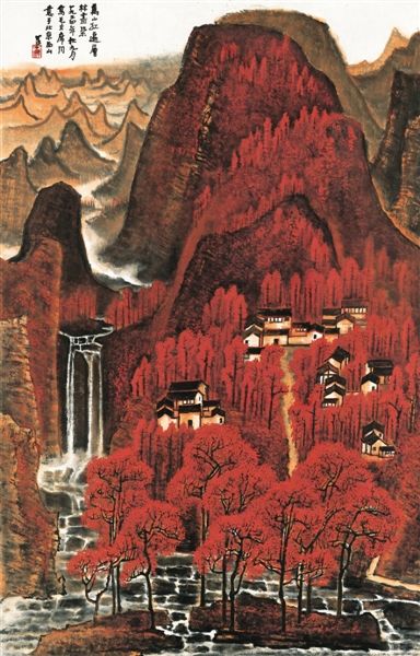 李可染創作于1964年的《萬山紅遍》取毛澤東“看萬山紅遍,層林盡染”詩句而成。1962至1964年之間,李可染偶得半斤故宮內府朱砂,便大膽嘗試用朱砂寫積墨山水,創作了“萬山紅遍”題材。據介紹,李可染“萬山紅遍”共有七幅存世,其中三平尺左右的兩件分別在1999年和2000年拍出400萬元和500萬元,以創紀錄的價位帶動了藝術品市場的發展,尺幅最大的三件作品中,兩件分別藏于中國美術館和榮寶齋,此次保利春拍上拍的這件十平尺的《萬山紅遍》是民間流通作品中尺幅最大的一件。