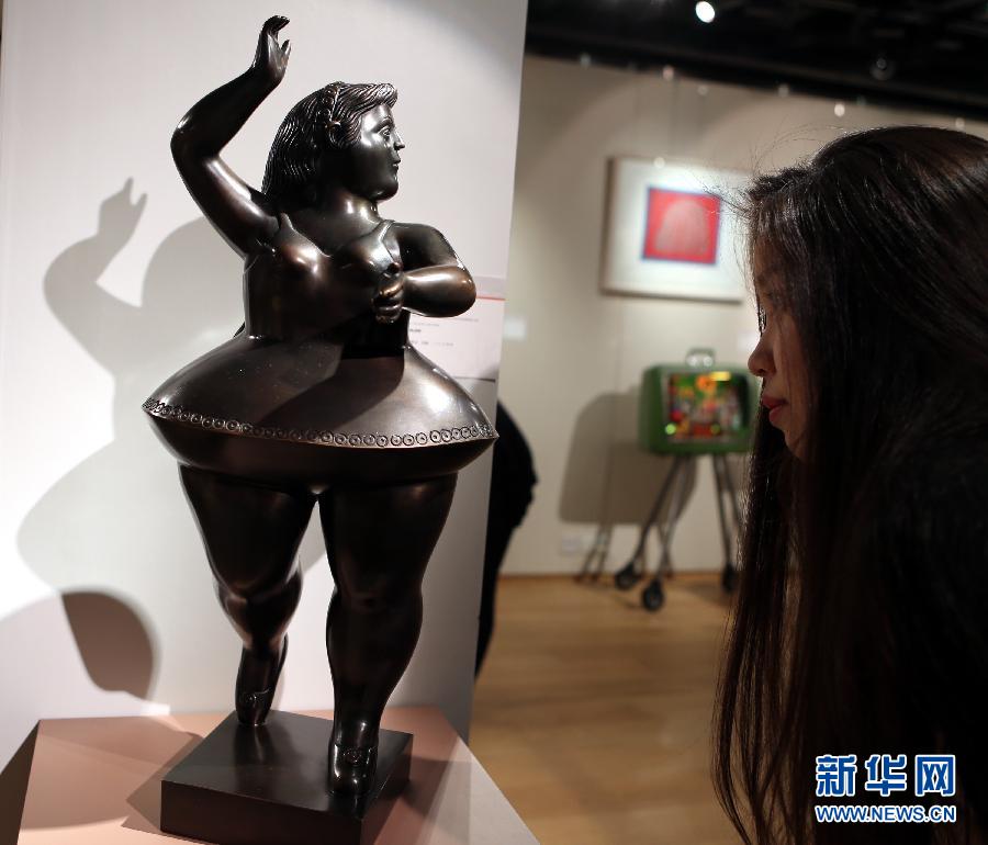 ??? 11月29日,一位觀眾在香港蘇富比《無界:當(dāng)代藝術(shù)》拍賣預(yù)展上觀看費(fèi)爾南多·波特羅的銅雕作品《芭蕾舞者》,該作品估價275—350萬港幣。香港蘇富比將于12月3日在港舉行《無界:當(dāng)代藝術(shù)》亞洲及西方當(dāng)代藝術(shù)拍賣會,這是蘇富比在亞洲舉行的首場同類型拍賣會。本次拍賣會共有80多件拍品,總估值4700萬—6800萬港幣,作品涵蓋油畫、雕塑、版畫、攝影作品等多種題材。(新華社記者 李鵬 攝)