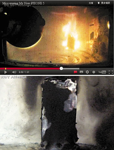 ??? 2012年9月,美國一名男子把最新推出的iPhone 5在微波爐中加熱,更把過程拍攝下來,上載至視頻分享網站YouTube,3天內已有逾6.7萬點擊率。“遭災”的iPhone 5雖出現裂痕,著火燃燒,但離奇地沒有爆炸解體。這名男子還將手機殘骸放上網拍賣,起拍底價為3001美元。據網上流傳的視頻片段所見,男子先展示了一臺全新未拆封的白色iPhone 5,再將其放進微波爐。微波爐運作后不久,手機便傳出爆裂聲,40秒后更起火燃燒,變成一個火球。3分鐘后,男子打開微波爐將火撲熄,手機機身已被燒至焦黑,外觀卻仍然完整。