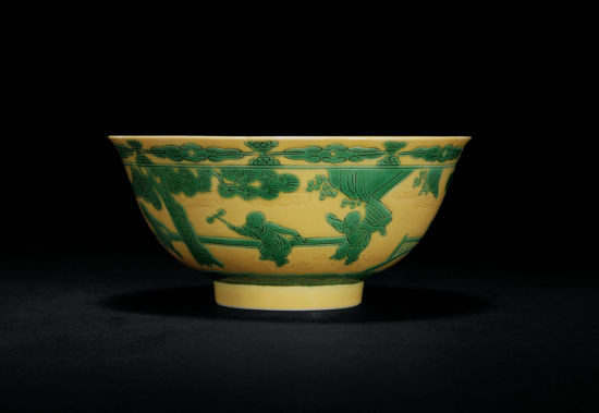 清雍正黃地綠彩嬰戲圖碗亮相永樂春拍