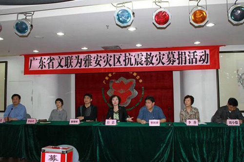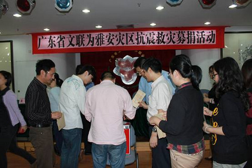 當(dāng)前,省文聯(lián)正在積極籌備27日組織廣東文藝界進(jìn)行賑災(zāi)義演募捐活動(dòng),廣東戲劇界28日將組織戲劇名家進(jìn)行義演募捐。省攝影家協(xié)會(huì)在雅安地震當(dāng)天就在協(xié)會(huì)活動(dòng)中向?yàn)?zāi)區(qū)捐款六千多元;連日來,許多藝術(shù)家、音樂人也在積極組織開展創(chuàng)作活動(dòng),如連向先、高翔等詞曲作者連夜創(chuàng)作了《我們和你在一起》、《我們一起扛》、《愛心飛翔》等歌曲,為災(zāi)區(qū)人民鼓勁。