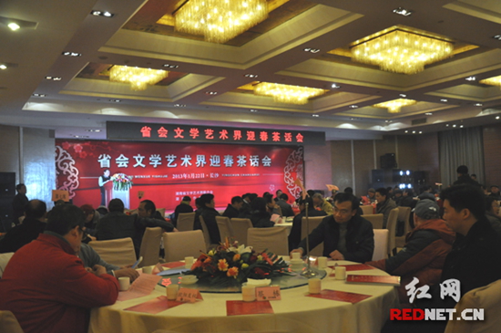 (在長(zhǎng)沙舉行的湖南省文學(xué)藝術(shù)界迎春茶話會(huì)開(kāi)風(fēng)氣之先,160余名省會(huì)文藝家和文藝工作者歡聚一堂,共品清茶,話舊歲迎新春。)