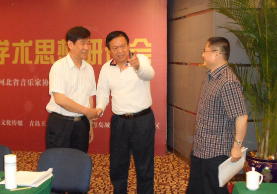山東省文聯(lián)黨組成員、副主席、音協(xié)主席張桂林(左),中共城陽區(qū)委常委尹世逸(中),山東省音樂家協(xié)會(huì)副主席劉新海在研討會(huì)上的留影 孟祥寧 攝