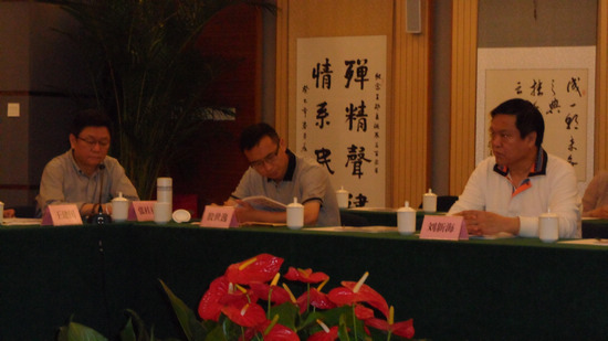 山東省音樂家協(xié)會(huì)副主席劉新海向中國藝術(shù)報(bào)社社長、中國文聯(lián)文藝資源中心主任向云駒(右),中國音協(xié)分黨組成員、副秘書長王建國(左)介紹有關(guān)律歷學(xué)家王邦直的情況 孟祥寧 攝