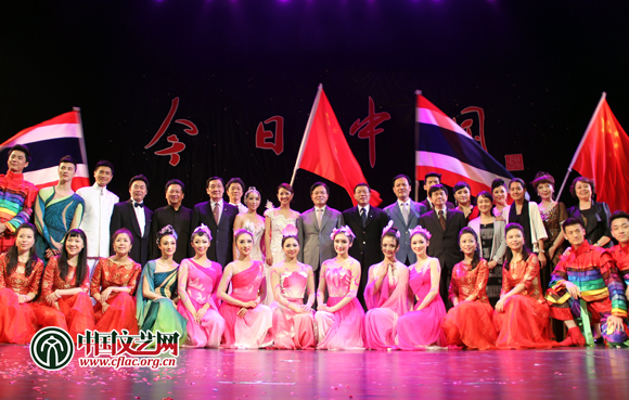 曼谷時間10月30日晚,由中國文聯與中國駐泰國大使館主辦、曼谷中國文化中心承辦,“今日中國”藝術周首場綜合文藝演出在泰國皇家旋宮劇院上演。泰國文化部部長頌塔亞·坤本,中國駐泰國大使寧賦魁,中國文聯黨組成員、書記處書記李前光等領導與當地觀眾一起觀看了演出。圖為觀看演出的領導與演員合影。中國文藝網 王春梅 攝