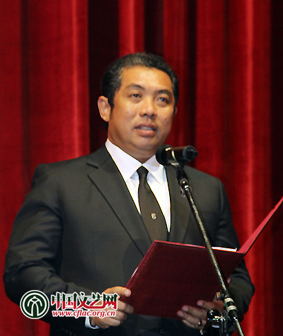 曼谷時間10月30日晚,由中國文聯與中國駐泰國大使館主辦、曼谷中國文化中心承辦,“今日中國”藝術周首場綜合文藝演出在泰國皇家旋宮劇院上演。圖為中國駐泰國大使寧賦魁致辭。中國文藝網 王春梅 攝