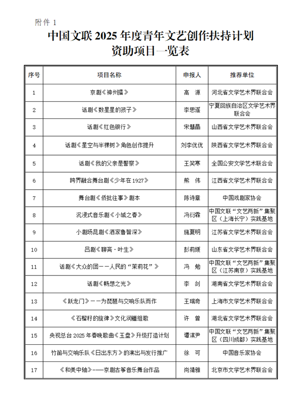 1.中國文聯2025年度青年文藝創作扶持計劃資助項目一覽表