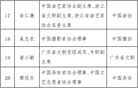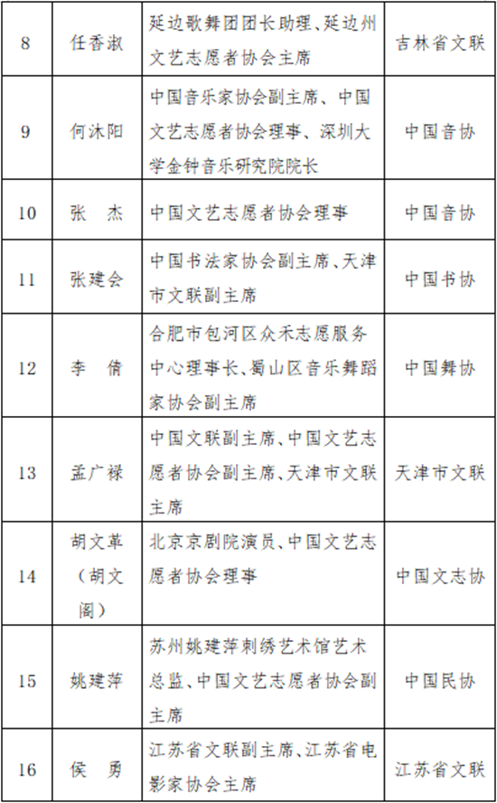 為了積極培育和踐行社會(huì)主義核心價(jià)值觀,大力弘揚(yáng)“奉獻(xiàn)、友愛、互助、進(jìn)步”志愿精神,培育志愿文化,發(fā)揮文藝志愿者先進(jìn)典型示范引領(lǐng)作用,引導(dǎo)全社會(huì)向先進(jìn)典型學(xué)精神、學(xué)品質(zhì)、學(xué)方法,推動(dòng)形成崇尚先進(jìn)、見賢思齊的濃厚氛圍,經(jīng)中央宣傳部批準(zhǔn),中國(guó)文聯(lián)首次開展了2025年度“ ‘時(shí)代風(fēng)尚’文藝志愿者”宣傳選樹活動(dòng)。經(jīng)中國(guó)文聯(lián)各團(tuán)體會(huì)員推薦、專家推選、社會(huì)公示等環(huán)節(jié),推選出2025年度“時(shí)代風(fēng)尚”文藝志愿者20人,現(xiàn)予以公布。