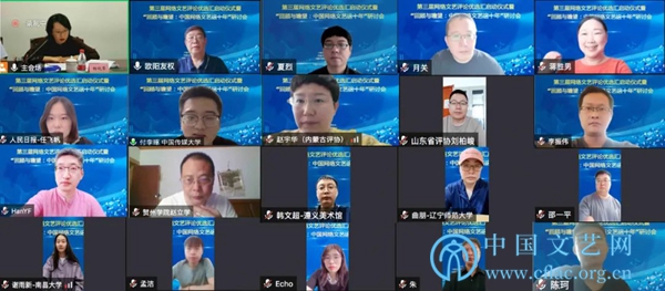 7月14日,由中國文藝評論家協(xié)會、中國文聯(lián)文藝評論中心主辦,中國文聯(lián)網(wǎng)絡(luò)文藝傳播中心協(xié)辦的“第三屆網(wǎng)絡(luò)文藝評論優(yōu)選匯”暨“回顧與瞻望:中國網(wǎng)絡(luò)文藝這十年”研討會在京舉行。圖為網(wǎng)上與會專家學(xué)者。