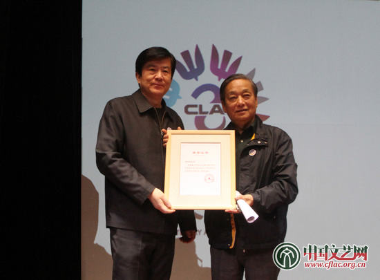 中國文聯黨組副書記、副主席李屹向韓美林頒發榮譽證書。中國文藝網 高晴 攝