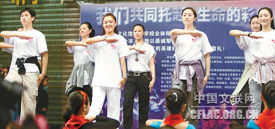 6月20日心理救援隊(duì)首先前往四川什邡市文化館舞蹈學(xué)校,到達(dá)后看到的是100多名舞蹈小學(xué)員整齊地站在文化館的門(mén)口迎接?吹竭@些平時(shí)只能在電視上見(jiàn)到的舞蹈家,孩子們急切、興奮地圍攏上來(lái)。當(dāng)馮雙白問(wèn)孩子們想不想跟舞蹈家們學(xué)習(xí)舞蹈時(shí),孩子們異口同聲地回答“想!”幾位舞蹈家站在文化館的臺(tái)階上,孩子們則站在人行便道上,跟著錄音機(jī)里的音樂(lè),一板一眼地學(xué)起了《升國(guó)旗儀式舞》。周邊的群眾看到這樣的情景都圍攏過(guò)來(lái)觀看,很多旁邊民居里的小孩子看到也都參加進(jìn)來(lái),幾遍下來(lái)孩子們就跳得有模有樣了。舞蹈家們走到孩子們中間為他們糾正動(dòng)作,給災(zāi)區(qū)的孩子們上了生動(dòng)而珍貴的一堂舞蹈課。