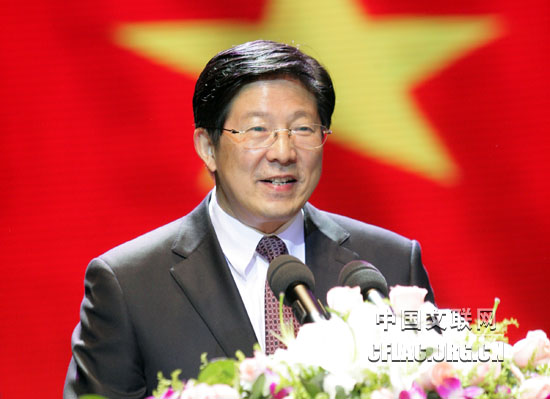 10月7日晚,由中國文聯和江蘇省人民政府共同主辦,江蘇省文化廳、江蘇省文聯、蘇州市人民政府聯合承辦的第八屆中國國際民間藝術節,在蘇州工業園區科技文化藝術中心隆重開幕。圖為中國文聯黨組書記、副主席胡振民致開幕詞。中國文聯網 余寧 攝