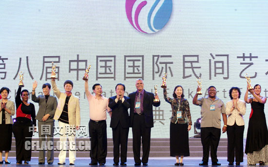 10月12日,第八屆中國國際民間藝術(shù)節(jié)頒獎典禮暨中外藝術(shù)家大聯(lián)歡在蘇州市相城區(qū)體育藝術(shù)館舉行。圖為馮遠等領導為參演的各國藝術(shù)團頒獎。中國文聯(lián)網(wǎng) 孟祥寧 攝