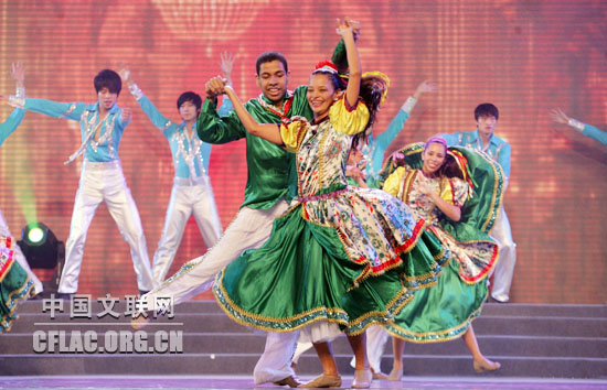 10月12日,第八屆中國國際民間藝術(shù)節(jié)頒獎典禮暨中外藝術(shù)家大聯(lián)歡在蘇州市相城區(qū)體育藝術(shù)館舉行。圖為巴西北大河州聯(lián)邦大學民間舞團演出《桑巴與肖特》。中國文聯(lián)網(wǎng) 孟祥寧 攝