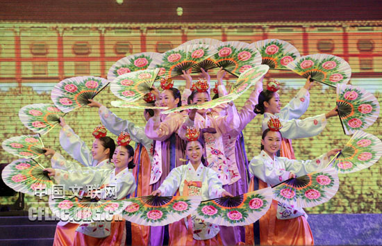 10月12日,第八屆中國國際民間藝術(shù)節(jié)頒獎典禮暨中外藝術(shù)家大聯(lián)歡在蘇州市相城區(qū)體育藝術(shù)館舉行。圖為韓國全銀子舞蹈團演出《花扇舞》。中國文聯(lián)網(wǎng) 孟祥寧 攝