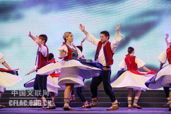 10月12日,第八屆中國國際民間藝術(shù)節(jié)頒獎典禮暨中外藝術(shù)家大聯(lián)歡在蘇州市相城區(qū)體育藝術(shù)館舉行。圖為捷克維薩坎民間舞團演出《瓦拉幾亞民間舞》。中國文聯(lián)網(wǎng) 孟祥寧 攝