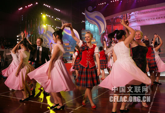 10月12日,第八屆中國國際民間藝術(shù)節(jié)頒獎典禮暨中外藝術(shù)家大聯(lián)歡在蘇州市相城區(qū)體育藝術(shù)館舉行。圖為英國蘇格蘭戈登舞蹈學校藝術(shù)團演員與中國演員互動演出。中國文聯(lián)網(wǎng) 孟祥寧 攝
