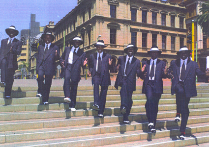 成立于1980年的“黑色旋風(fēng)”合唱組,來自于南非高騰省。憑借著他們對自己民族土生土長的音樂舞蹈的摯愛和在發(fā)展道路上的執(zhí)著與堅韌不拔,他們在獲得了各種榮譽(yù)的同時,也獲得了各國觀眾的喜愛。1996年,作為南非前總統(tǒng)曼德拉對英國進(jìn)行國事訪問的一個組成部分,該團(tuán)被邀請在倫敦的皇家音樂廳表演。迄今,該團(tuán)已經(jīng)發(fā)行了多張唱片。